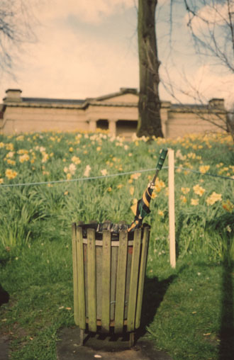 A long Easter weekend visiting York but cutting through the Park to the Station and the train ride home. Chance upon this umbrella skewering the bin. I take a couple of photos and we scurry on, only to run slap bang into a building football riot on the edge of York city centre; police everywhere ready for trouble and gangs of York City fans ready to do battle with some apparently aggrieved visiting club.